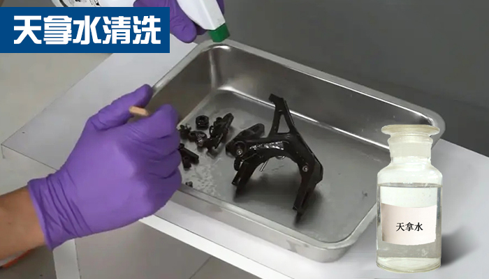 天拿水清洗,需要存放晾干,用量适当与温和,天拿水挥发性高,效果适中,是比较不错的清洗方法,但是也可能会清理得不够彻底,二次加工会有一些残余。