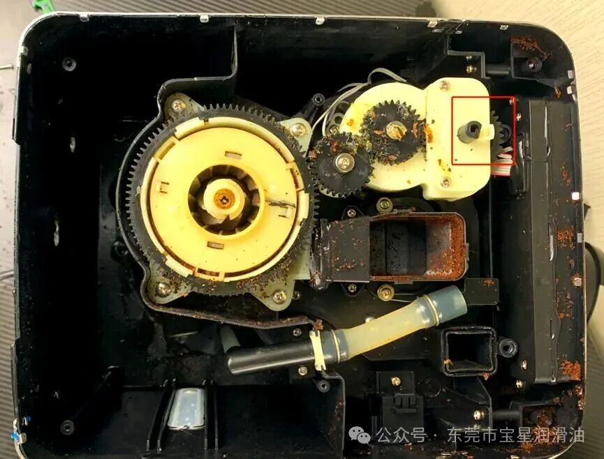 咖啡机内部普遍存在温升、水汽和咖啡粉污染问题。润滑脂一旦抗氧化或抗污染能力不足,容易变干、结焦,甚至吸附粉尘形成油泥,不仅加剧齿轮磨损,还会进一步放大运转噪音。