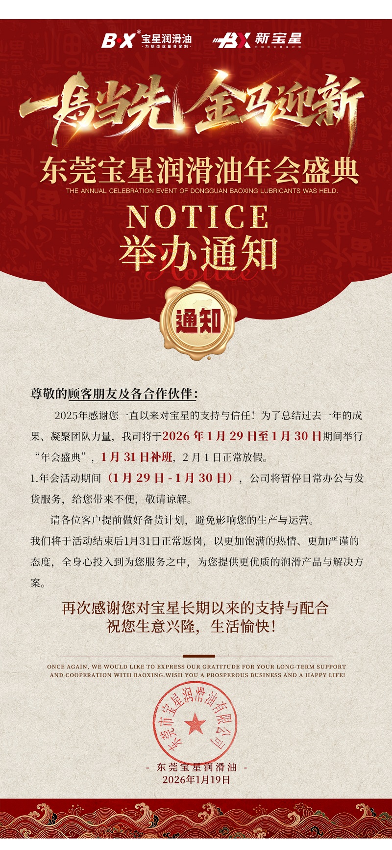年会活动期间(1 月 29 日 - 1 月 30 日),公司将暂停日常办公与发货服务,给您带来不便,敬请谅解。请各位客户提前做好备货计划,避免影响您的生产与运营。我们将于活动结束后1月31日正常返岗,以更加饱满的热情、更加严谨的态度,全身心投入到为您服务之中,为您提供更优质的润滑产品与解决方案。再次感谢您对宝星长期以来的支持与配合,祝您生意兴隆,生活愉快!